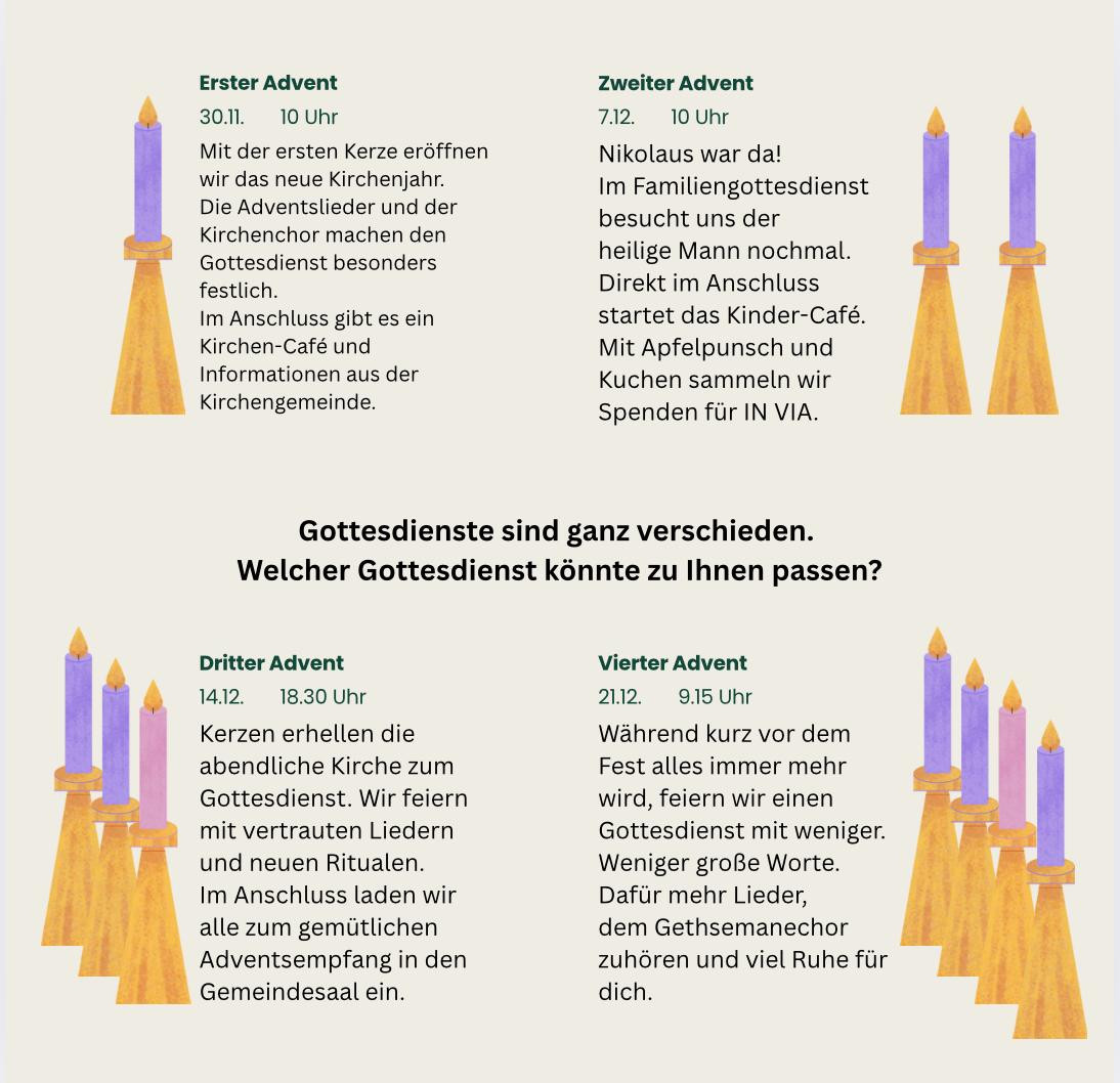 - Wir feiern am Sonntag, den 7.12. um 10 Uhr Familiengottesdienst mit Pfarrerin Anna Bamberger. Anschließend herzliche Einladung zum Kindercafe.